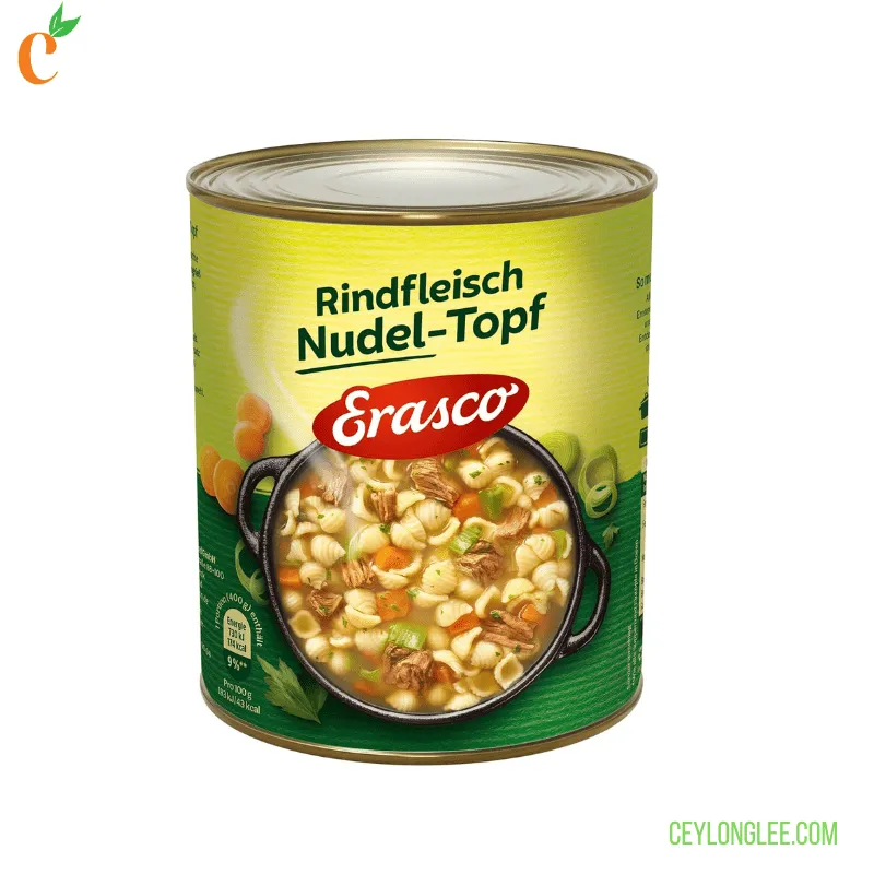 Indulge in the rich, comforting flavors of Erasco Beef Pasta Pot , a classic German stew featuring tender cooked beef, spiral pasta, and a medley of vegetables. Made with 4.7% succulent beef pieces, 18% delicate mussel noodles (crafted from wheat semolina and egg white), and fresh vegetables like carrots, leek, and celery. this hearty meal delivers a balanced blend of protein and carbohydrates. Enhanced with palm fat and iodized salt for depth, it’s perfect for quick dinners or warming lunches. Simply heat and serve 2-3 portions straight from the tin.