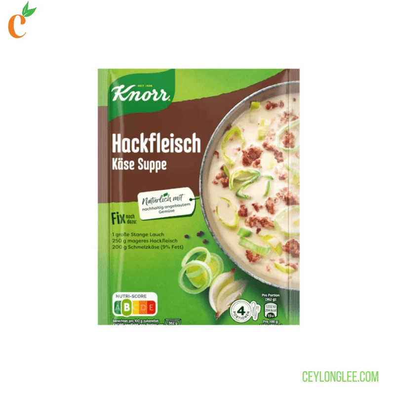 Indulge in the comforting flavors of Knorr Fix Hackfleisch Käse Suppe , a traditional Austrian and Southern German specialty crafted for convenience and authenticity. This creamy soup mix combines minced meat, potatoes, onions, leeks, and melted cheese for a rich, savory dish that’s ready in minutes. Free from artificial flavors, preservatives, and dyes, it’s a wholesome choice for family meals