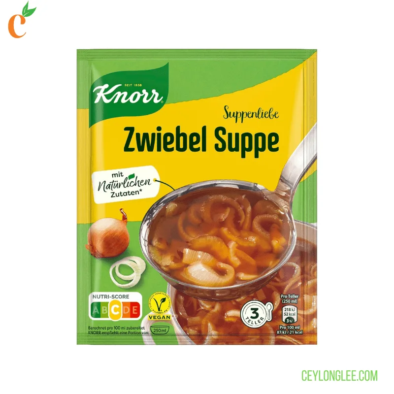 Indulge in the rich, savory flavor of ceylonglee Onion Soup , a classic German specialty crafted with 40% roasted onions (pieces and powder) for an authentic taste. This quick-prep soup combines high-quality ingredients like yeast extract, sunflower oil, and a hint of fructose for natural sweetness, delivering a comforting meal in minutes. Perfect for cozy dinners or light lunches, it serves 3 portions per pack.