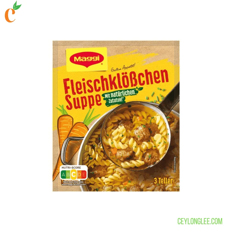 Savor the robust flavors of Maggi Fleischklößchen Suppe , a traditional German soup featuring tender pasta spirals and savory beef meatballs. Made with 64% pasta (wheat flour and egg white) and 12% beef meatballs (crafted from beef, wheat flour, and aromatic onions). this soup delivers a comforting, protein-rich meal. Enhanced with a rich broth infused with onion and beef fat for depth, it’s perfect for quick dinners or warming lunches. Simply add boiling water for 3-4 hearty servings in minutes.