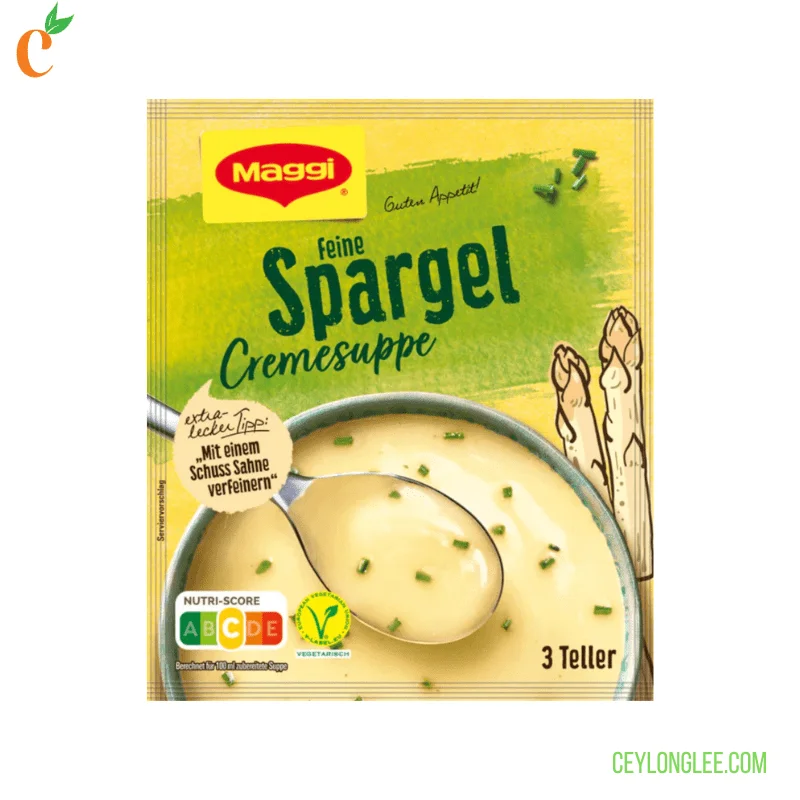 Indulge in the smooth, comforting flavors of Maggi Guten Appetit Asparagus Cream Soup , a classic German recipe featuring 5% real asparagus and aromatic chives. Crafted with a rich roux (wheat flour and palm fat), potato starch, and a hint of turmeric for warmth, this soup delivers a creamy texture and vibrant taste. Perfect for quick lunches or cozy dinners, it serves 4 plates (750ml) in minutes—simply add boiling water.