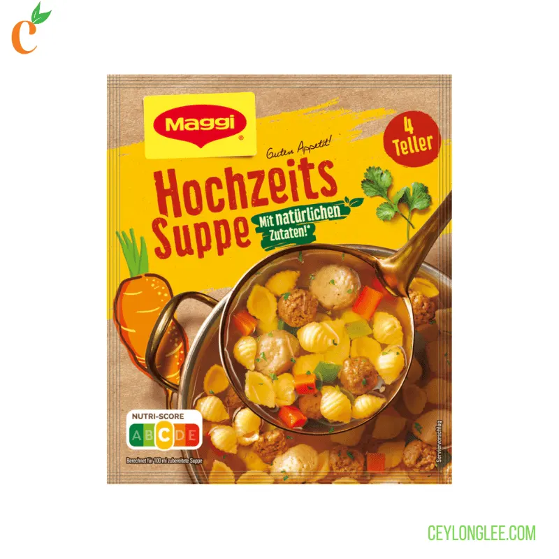 Indulge in the timeless flavors of Maggi Guten Appetit Hochzeits Suppe , a classic German wedding soup featuring 52.6% delicate durum wheat noodles, 14% silky Grießklößchen (semolina dumplings), and savory Fleischklößchen (meat dumplings). Enhanced with aromatic vegetables and a clear, light broth, this soup combines tender textures and subtle seasoning for a comforting meal. Perfect for celebrations or cozy dinners, it serves 4 portions in minutes—simply add boiling water.