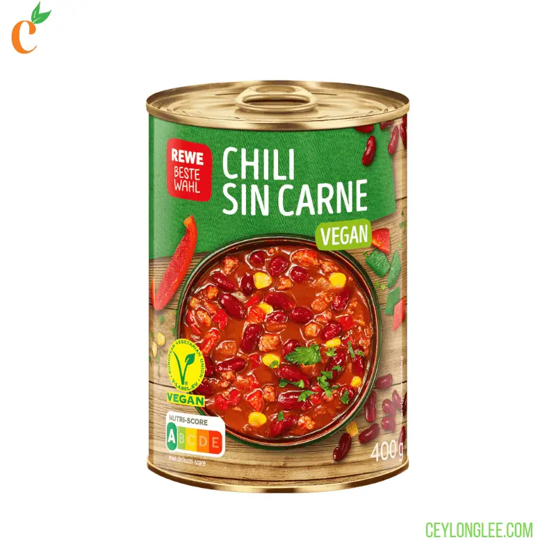 Indulge in the bold flavors of REWE Beste Wahl Chili sin Carne vegan , a zesty Mexican-inspired stew crafted with 31% red kidney beans, juicy tomatoes, and 3% textured soy protein for a meat-free protein boost. Packed with sweet corn, bell peppers, and onions in a rich tomato sauce, this dish balances heat and sweetness for a satisfying meal. Perfect for quick lunches or dinners, it’s ready to heat and serve straight from the can.