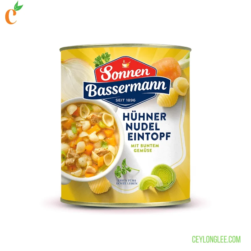 Indulge in the comforting flavors of Sonnen Bassermann Hühner-Nudel-Eintopf , a classic German stew featuring 26-28% tender cooked noodles (crafted from durum wheat semolina and chicken egg white) and 3.7% savory cooked chicken (made with real chicken meat and seasoned with salt) Enhanced with a colorful medley of vegetables, including carrots, green beans, and leek, this stew offers a balanced blend of protein, carbs, and fresh garden flavors. Perfect for quick dinners or warming lunches, it serves 2-3 portions straight from the tin in minutes.
